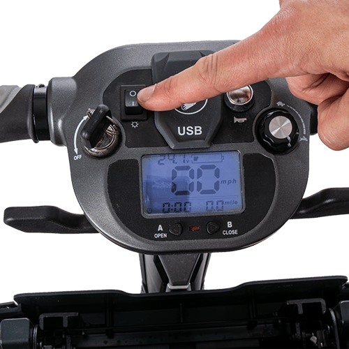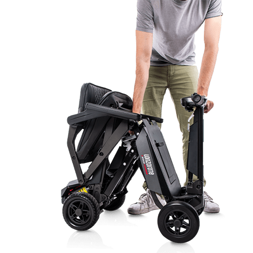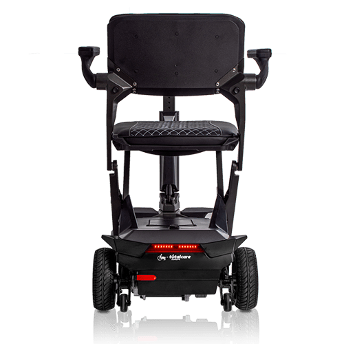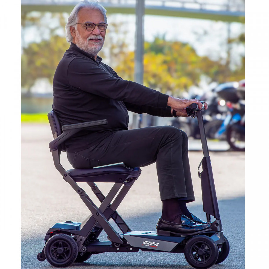 Gracias a su sistema de plegado electrónico, el scooter puede cerrarse cómodamente desde el joystick o mediante un mando Bluetooth, permitiendo guardarlo o transportarlo sin esfuerzo.